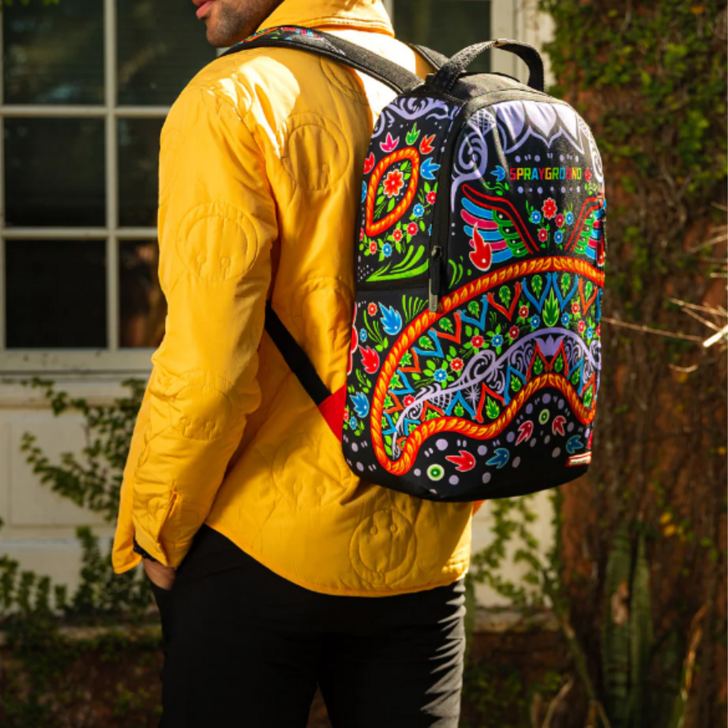 Dimensions: 18" x 6" x 11.5" • Front zipper pocket • Side pockets • Zippered Stash pocket • Separate velour sunglass compartment • Ergonomic mesh back padding • Adjustable Straps for custom sizing • Gold zippers with metal hardware • Metal "Sprayground Authentic" badge • Slide through back sleeve connects to carry-on luggage to free your hands